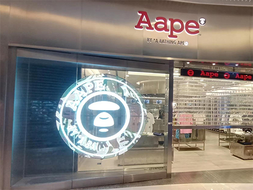 Aape是香港I.T集團的知名日系街頭潮牌,智彩科技為廣州天環(huán)廣場Aape門店量身定制透明led顯示屏